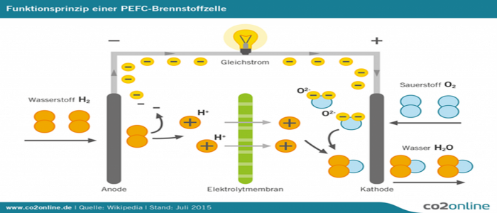 Hidrojen gazı anot yanına veriliyor. Pozitif hidrojen iyonları membranda ayrılarak katota doğru ilerliyorlar. Membran, hidrojenin negatif elektronlarının geçmesini engelliyor Negatif elektronlar anottan (telden katota doğru) bir voltaj oluşturarak elektrik akımına neden oluyorlar. Katot yanından verilen havanın içindeki oksijen, pozitif hidrojen iyonları ve elektronlarla birleşiyor, sonunda su açığa çıkıyor.