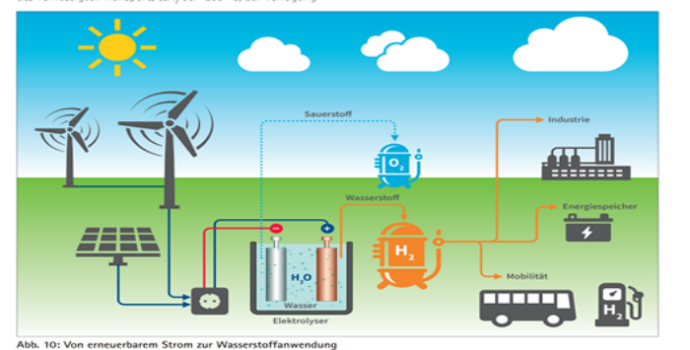 Elektroliz, suyun bileşenleri olan hidrojen ve oksijeni birbirinden ayırıyor. Eğer elektrolizde kullanılan elektrik enerjisi yenilenebilir enerjilerden (YE) sağlanıyorsa buna ‚yeşil hidrojen‘ deniyor. Böylelikle özellikle güneş enerjisinden yaz aylarında ve öğlenleri ya da çok rüzgârlı günlerde üretilen aşırı elektrik, elektroliz yoluyla hidrojende depolanmış olurken, çevreye sadece su buharı salınıyor.