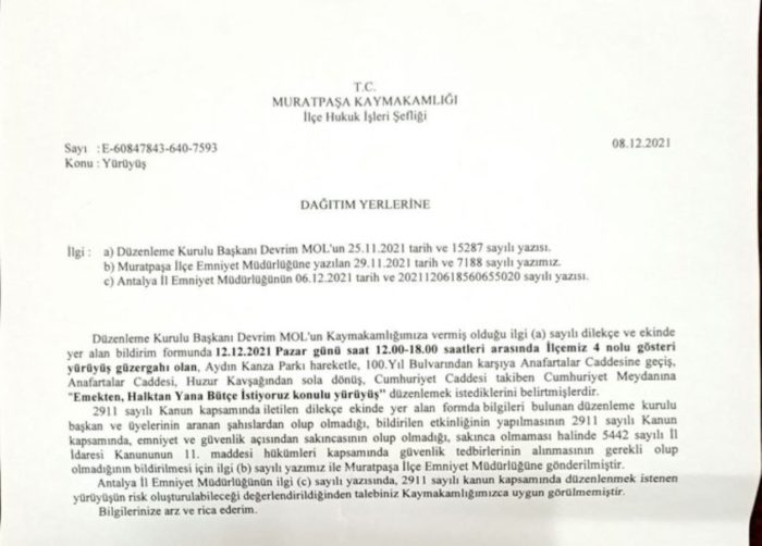 KESK, DİSK, TMMOB ve TTB tarafından 12 Aralık 2021 Pazar günü Antalya’da yapılması planlanan miting Muratpaşa Kaymakamlığı tarafından yasaklandı.