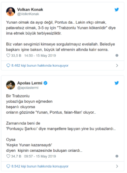 Tevfik Göksu’nun sözleri tepki çekti. Trabzonlu sanatçı Volkan Konak, Twitter hesabından yaptığı paylaşımda “Yunan olmak da ayıp değil, Pontus da… Lakin ırkçı olmak, patavatsız olmak, 3-5 oy için ‘Trabzonlu Yunan kökenlidir’ diye ima etmek büyük terbiyesizliktir. Biz vatan sevgimizi kimseye sorgulatmayız evelallah. Belediye başkanı işine baksın, büyük laf etmenin altında kalır sonra” ifadelerine yer verdi.