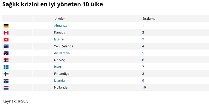 Raporda ilk 10 sırayı koronavirüsle mücadelede diğer ülkelere göre daha başarılı olan ülkelerin aldığı belirtildi.
