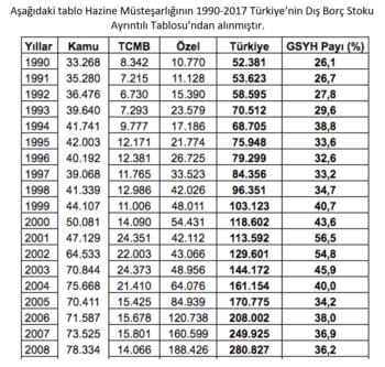 - Kara Çarşamba olarak bilinen 2001 krizi, orta vadede büyük değişikliklerin yaşanmasına neden oldu. Binlerce esnaf kepenk kapattı, milyonlarca çalışanın işsiz kalmasına neden oldu. Kısacası dünyada da görünen bu kriz, Türkiye üzerinde Aysun Bayhan’ın deyimiyle bir silindir gibi geçti. Bu tarihte Rusya’da ekonomik kriz büyüdüğü için Türkiye, en önemli ihracat ve Turizm partnerini kaybederek, bavul ticareti iflas etti. Net sermaye akımları negatife dönüştü, iç borçlanma faizleri yükseldi ve ekonomi % 6 gibi inanılmaz bir küçülmeye seyirci kaldı. [6] 2001 krizinin etkileri bir yıl sonra ortaya çıktı. Aynı tarihlerde Arjantin’de de kriz vardı. Arjantin dış borçlarını sadece % 10’u ödeyerek, ilişkileri kesme yoluna gitti. Türkiye, dış borçlarının tamamını ödeyerek, dış borçlanmaya dayalı ekonomi modelini seçti.[7] 2002 yılı itibariyle dış borç 130 milyar dolar civarında seyretti. Bu rakam, Gayri Safi Milli Hasıla’nın (GSMH) % 54,8’ini oluşturdu.