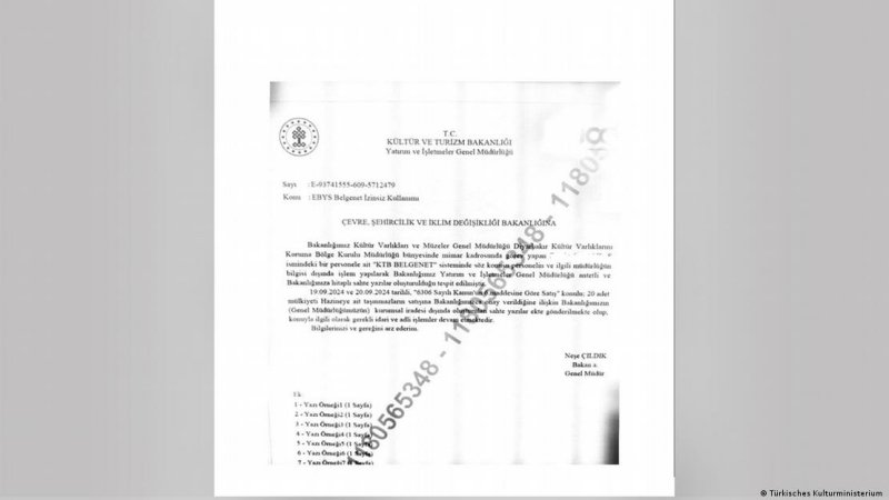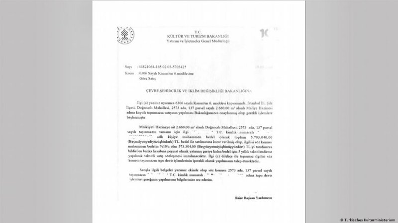 DW Türkçe’nin ulaştığı belgelere göre, İstanbul’un Şile ilçesi Doğancılı Mahallesi’nde bulunan ve Hazine mülkiyetindeki 2.659 metrekarelik denize sıfır arazi için 19 Eylül 2024’te Çevre, Şehircilik ve İklim Değişikliği Bakanlığı’na sahte bir yazı gönderildi. Yazıda, Kültür ve Turizm Bakanlığı’nın söz konusu taşınmazın satışına onay verdiği ileri sürüldü.