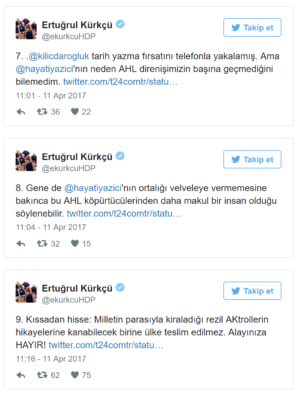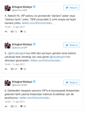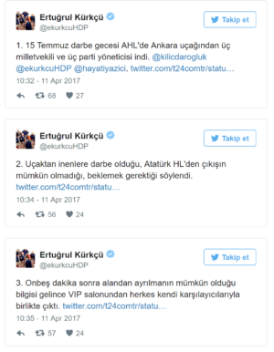 Kürkçü Twitter’dan yaptığı açıklamalarda şunları söyledi: “15 Temmuz darbe gecesi AHL’de Ankara uçağından üç milletvekili ve üç parti yöneticisi indi. @kilicdarogluk @ekurkcuHDP @hayatiyazici… On beş dakika sonra alandan ayrılmanın mümkün olduğu bilgisi gelince VIP salonundan herkes kendi karşılayıcılarıyla birlikte çıktı. Atatürk HL VIP salonu ve çevresinde ‘darbeci’ asker veya ‘darbeci tankı’ yoktu. TEM çıkışındaki 2 zırhlı araçta da hiçbir hareket yoktu. kilicdarogluk’nun AHL’den ayrılışını gördüm ama üstüne çıkılacak tank olmadığı için olsa gerek @hayatiyazici’nın direnişini göremedim. Darbecileri her şeyin yanı sıra VIP’e el koymayarak Ankara’dan gelenleri tarih yazma fırsatından mahrum bıraktıkları için de lanetliyoruz. @kilicdarogluk tarih yazma fırsatını telefonla yakalamış. Ama @hayatiyazici’nın neden AHL direnişimizin başına geçmediğini bilemedim. Gene de @hayatiyazici’nın ortalığı velveleye vermemesine bakınca bu AHL köpürtücülerin den daha makul bir insan olduğu söylenebilir.”