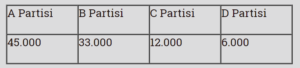 Tabloda, gözümüze ilişen en büyük 6 rakamı seçtiğimizde, X şehrimizde A Partisi’nin 3, B Partisi’nin ise 2, C Partisi’nin ise 1 milletvekilli çıkardığını, D Partisi’nin ise milletvekili çıkaramadığını görürüz.
