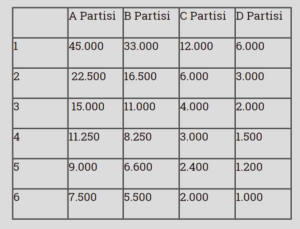 Elbette ki partilerin aldıkları oylar, hiçbir seçimde böylesine yuvarlak rakamlara tekabül etmez. Ayrıca 96 bin geçerli oy kullanılan bir seçim çevresi de 6 milletvekilliği ile parlamentoda temsil edilmez. Ancak anlatacaklarımı özetleyebilmek ve bölme işlemlerini kolaylaştırmak için böyle bir senaryoyu kabul edelim. Hemen belirtelim ki, bu bir senaryo değil de gerçekten bir genel seçimde olsaydı da hesaplama asla, ama asla değişmeyecekti. Senaryomuza dönelim. Son yasal düzenlemeler olmasaydı. X ilindeki 6 milletvekilliğinin dağımı için şöyle bir tablo yapılacaktı (Elbette artık bunlar elde kalem, A4 kâğıtlara çizilen tablolara tükenmez kalemle yazılarak yapılmıyor. Bilgisayarlar aracılığı ile yapılıyor.)