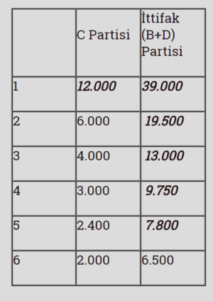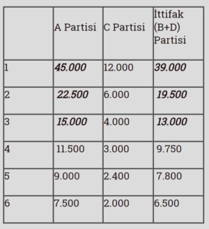 Şehrimiz yine aynı, oy dağılımları aynı. Ancak B ve D partileri ittifak yaptıkları için onların oylarını toplayarak İttifak Partisi sütununa yazalım. Oylarda ne bir artış, ne bir azalış var; herşey aynı. İttifakın (B+D partileri) toplam oyu (33.000+6.000) 39.000’dir. Şimdi tablomuzu bir kez daha düzenleyelim.