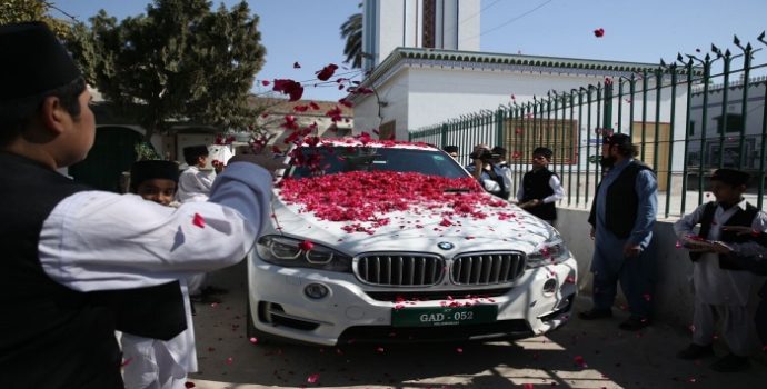 PAKİSTAN’A JETLE GİTTİ, GÜLLERLE KARŞILANDI