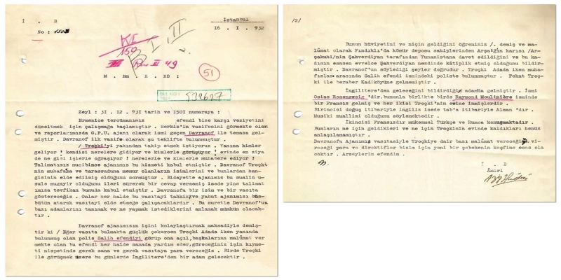İstanbul Bölge Amiri Aziz Hüdai Bey imzalı belgeye göre, Sovyet gizli servisi GPU’nun (Devlet Siyasi İdaresi) ajanı Davranof, Troçki’nin hareketlerini izlemek için yerel bir ağ kurma çabasındaydı. Raporda, Ermeni tercüman üzerinden temas kurulan Davranof’un, “Troçki’nin ziyaretçileri, gittiği yerler, evindeki faaliyetler ve yazışmaları”nı takip etmek istediği, bu amaçla polis memuru Salih Efendi’yi hedef gösterdiği aktarılıyor.