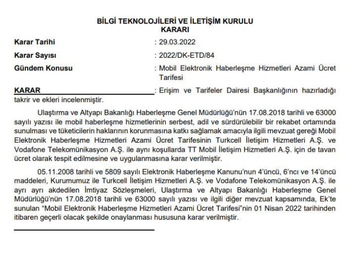 Bilgi Teknolojileri ve İletişim Kurumu’nun (BTK) internet sitesinde yer alan ve BTK’nın Erişim ve Tarifeler Dairesi Başkanlığı tarafından hazırlanan kurul kararına göre, mobil şebekelerden yapılan yurtiçi aramalarda azami ücret 87.53 kuruştan 1.23 TL’ye yükseldi.
