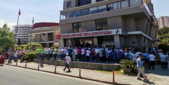 Narlıdere Belediyesi’ni temsilen Sosyal Demokrat Kamu İşverenleri Sendikası (SODEMSEN) ile belediyede örgütlü olan Belediye-İş Sendikası İzmir 2 No’lu Şube ile arasında yapılan Toplu İş Sözleşmesi (TİS) görüşmelerinde uzlaşma sağlanamaması nedeniyle grev kararı alınmıştı. Belediye-İş Sendikası yetkilileri ve sendika üyesi işçiler bugün Narlıdere Belediyesi hizmet binasının önünde toplanarak, grev kararını binanın kapısına astı. Uzlaşma sağlanamaması durumunda işçiler grevi başlatacaklarını duyurdu.