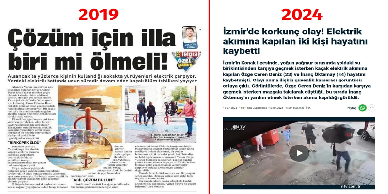 İzmir’de, yoldaki su birikintisine basarak elektrik akımına kapılan iki vatandaş hayatını kaybetti. Ege Telgraf gazetesi, muhabiri Utkucan Akkaş’ın imzasını taşıyan “Çözüm için illa biri mi ölmeli” başlıklı haberinde beş yıl önce o sokaktaki elektrik kaçağına dikkat çekmişti. Gazeteciler görevini yaptı, yetkililer yapmadı ve bu yüzden insanlar can verdi.