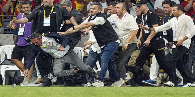 Sarı-kırmızılı tribünlerden Ali Koç’a yönelik yabancı maddeler, özellikle su şişeleri fırlatıldı. Koç, saha kenarında yürüdüğü sırada akreditasyon kartı bulunan bir kişi tarafından arkadan itilerek yere düşürüldü.