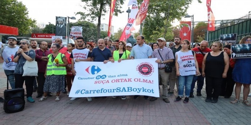 İstanbul’un Esenyurt ilçesinde bulunan Carrefoursa deposunda, 12 Ağustos’ta 6 işçinin işten çıkarılmasıyla başlayan direniş, Depo, Liman, Tersane ve Deniz İşçileri Sendikası (DGD-Sen) öncülüğünde 16. gününde devam ediyor. Mücadeleci sendikalar, işçilere destek olmak amacıyla Madenci Anıtı önünde bir basın açıklaması gerçekleştirdi. Açıklamada, “Carrefoursa’dan alma suça ortak olma” pankartı açılırken sık sık, “İşçiler açken Sabancı’ya huzur yok”, “Direne direne, direnişten zafere” sloganları atıldı.