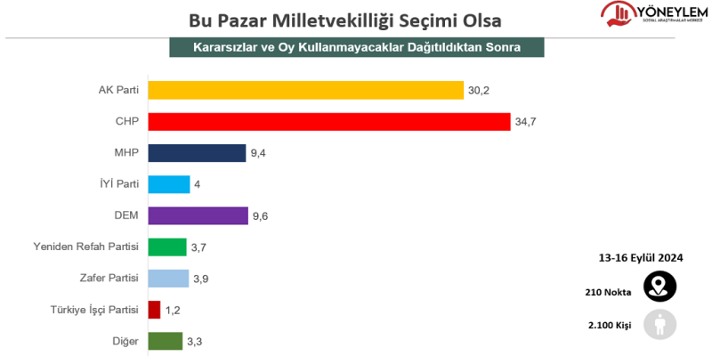 Yöneylem Araştırma, 13-16 Eylül 2024 tarihleri arasında yaptığı “Bu Pazar Milletvekilliği Seçimi Olsa” anketinin sonuçlarını kamuoyu ile paylaştı. Ankette, 2 bin 100 kişiyle yapılan görüşmeler sonucunda, “kararsızlar ve oy kullanmayacaklar” dağıtıldıktan sonra CHP, yüzde 34.7 puan ile ilk sıraya yerleşti. AKP ise yüzde 30.2 oy oranı ile ikinci sırada kaldı.
