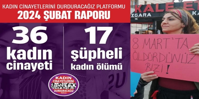 Şubat ayında 36 kadın erkekler tarafından öldürüldü. Bu sayı, Ocak ayında 28 olan kadın cinayetlerinin yüzde 28 arttığını gösteriyor. Kadın Cinayetlerini Durduracağız Platformu (KCDP), Şubat ayı raporunu açıkladı. Rapora göre, Şubat ayında 36 kadın erkekler tarafından öldürüldü, 23 kadın şüpheli bir şekilde hayatını kaybetti, 12 kadın ise intihar etti.