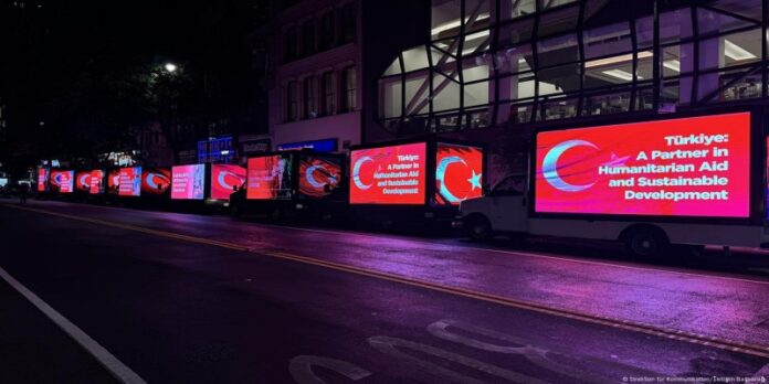 DW Türkçe’den Pelin Ünker’in hazırladığı habere göre, Erdoğan’ın ABD’ye adım atmasıyla New York sokaklarında dikkat çeken dijital ekranlı kamyonetler, üzerinde Türkiye’yi öven sloganlar taşıyarak dolaşmaya başladı. “Adil Bir Dünya İçin Reforme Edilmiş Bir BM” gibi küresel mesajlar taşıyan bu araçlar, Türkiye’nin uluslararası arenadaki itibarını güçlendirmek için tasarlanmış bir imaj kampanyasının parçası olarak lanse edildi. Ancak uzmanlar, bu tür reklam hamlelerinin gerçekte ne kadar etkili olduğunu sorguluyor.