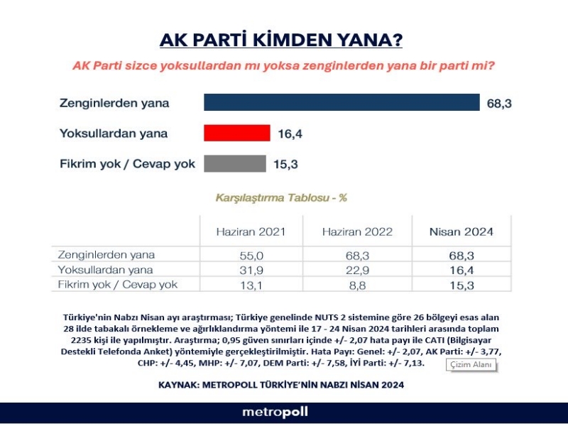Türkiye’de siyasi eğilimler ve kamuoyu algıları üzerine yapılan araştırmalar, toplumun nabzını tutmanın yanı sıra, siyasi partilerin politikalarının ve söylemlerinin halk nezdinde nasıl karşılık bulduğunu anlamamıza yardımcı olur. Metropoll Araştırma’nın son kamuoyu araştırması, seçmenlerin büyük bir çoğunluğunun, iktidardaki Adalet ve Kalkınma Partisi’ni (AKP) zengin kesimlerden yana olarak gördüğünü ortaya koydu.