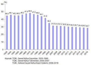 Türkiye’de çocukların genel nüfusa oranının giderek azaldığı, 1935’te nüfusun yüzde 45’ini oluşturan 0-17 yaş grubunun 2008’de yüzde 31.5’ini, 2016’da ise yüzde 28.7’sini oluşturduğu belirlendi.