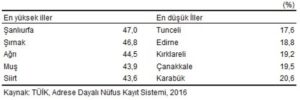 Çocuk nüfus oranının en düşük olduğu iller ise yüzde 17.6 ile Tunceli, yüzde 18.8 ile Edirne ve yüzde 19.2 ile Kırklareli.