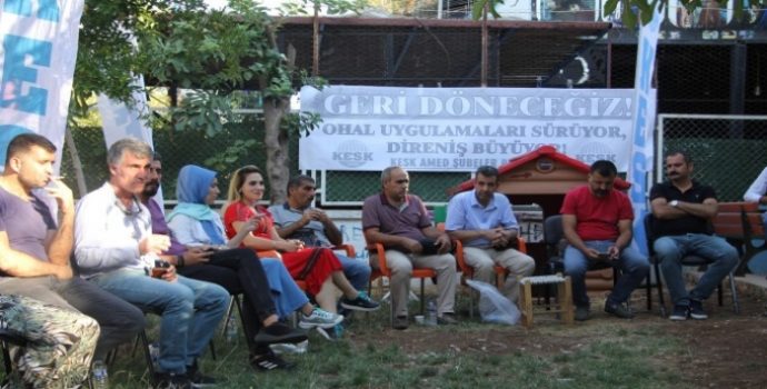 Kamu Emekçileri Sendikaları Konfederasyonu (KESK) Amed Şubeler Platformu, OHAL rejiminin 6’ncı yıl dönümüne ilişkin, Eğitim-Sen 2’No’lu Şube binasında başlattığı “adaletsizliğe karşı adalet nöbeti” eylemi 2’nci gününde devam etti. “Geri döneceğiz, OHAL uygulamaları sürüyor, direniş büyüyor” pankartlarının asıldığı salonda açıklama yapan Eğitim-Sen 2 No’lu Şube Eş Başkanı Hasan Çıtrık, “İktidarın başlattığı adaletsizliğin KHK uygulamalarının devam ettiğini görüyoruz. Yapılan yanlışların, haksızlıkların hukuksal anlamda hem davacısı, hem de takipçisi olacağız” dedi.