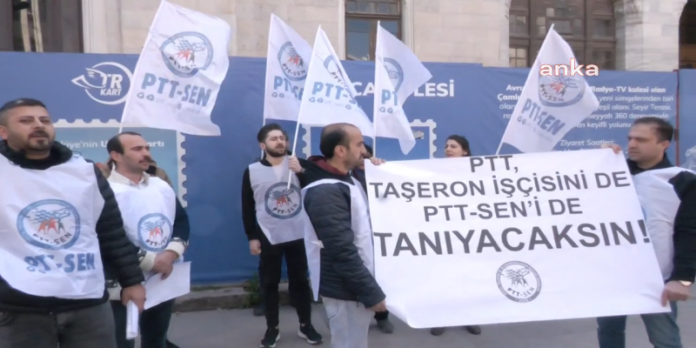 PTT bünyesinde taşeron olarak çalışan 17 binden fazla işçinin sesi bir kez daha İstanbul’da yükseldi. Sirkeci’deki PTT İstanbul Başmüdürlüğü önünde bir araya gelen PTT-SEN üyeleri, yalnızca kadro değil, anayasal hak olan sendikal örgütlenme taleplerini de duyurmak için basın açıklaması yaptı. Ancak ne yazık ki 184 yıllık bu kamu kurumu, kendi üniformasını giyen, kendi araçlarını kullanan bu işçileri görmezden gelmeye devam ediyor.