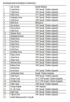 Roboski’de 38 kişilik kafilenin üzerine bomba yağdırıldı. Yarısı çocuk, 34 can alındı. Gece saat 21:39 – 22:24 arasında Roboski köyüne çay ve mazot getiren köylülerin arasına Bahoz Erdal kod adlı Ferman Hüseyin’in karıştığı ihbarı üzerine kafile, F16 savaş uçaklarının bombardımanına uğradı. 26’sı Encü ailesine mensup olmak üzere 34 insanımız katledildi. Bunların arasında çocuk yaşta olanların sayısı 19… Yaralanan 4 kişi kurtuldu. Bahoz Erdal için 34 masum insanın katledilmesi hangi ahlaka, insanlığa ve hukuka uygundur? Ama Kürtler olunca buna değerdi, özellikle milliyetçi, mukaddesatçı Türkiye için! Çünkü “en iyi Kürt, ölü Kürt”tür. Çünkü “her Kürt, potansiyel düşmandır ve hedefimizdir” ön yargısı hâkimdi milliyetçi ve mukaddesatçı Türkiye yönetimleri için… Belki de bu bir mesajdı. Katliamdan sağ kurtulan Servet Encü köye giderek olayı anlatmasıyla duyurmuştu. İlk haber, Dicle Haber Ajansı (DİHA) tarafından saat 01:52’de verilmişti. “Savaş uçakları köylüleri vurdu, 20’ye yakın ölü” başlığıyla verilmişti. Servet Encü’nün anlattıkları “Geri döndüğümüz sırada jetler bizi bombardımana tuttu. Acı bir koku etrafı sardı. Birden insanlar yanarak can verdi. 5-6 kişi bombardımandan kaçarak kayalıkların arasına saklandı. Uçaklar orayı da bombaladı. Hepsi kayalıkların altında can verdi” şeklindeydi. Parçalanmış atlar ve katırlardan bugüne kadar hiç kimse bahsetmedi bile.