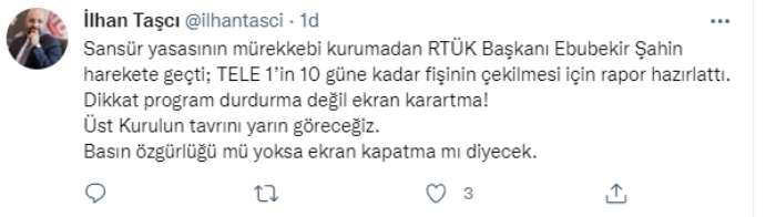 ‘Sansür yasası’nın yürürlüğe girmesiyle birlikte, Twitter hesabından açıklama yapan İlhan Taşçı, “RTÜK Başkanı Ebubekir Şahin harekete geçti; TELE 1’in 10 güne kadar fişinin çekilmesi için rapor hazırlattı. ” dedi.