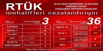 Taşçı’nın paylaştığı diğer verilere göre ise RTÜK, söz konusu tarihler arasında Halk TV’ye 10 kez idari para cezası, toplam 12 program için 3 kez yayın durdurma cezası verdi. RTÜK, TELE 1 kanalına ise 8 kez idari para cezası, toplam 10 program için 3 kez yayın durdurma cezası verdi. FOX kanalı için 7 kez idari para cezası uygulayan RTÜK, toplam 3 program için ise 1 kere yayın durdurma cezası verdi. RTÜK, KRT Televizyonu’na ise 3 kez idari para cezası, 2 program için 1 yayın durdurma cezası verdi.