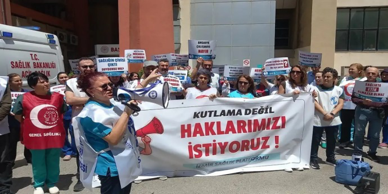 İZMİR – Türkiye’de sağlık sistemi bir krizden diğerine savrulurken, 12 Mayıs Hemşireler Günü, İzmir’de sağlık emekçilerinin çığlığına sahne oldu. Atatürk Eğitim ve Araştırma Hastanesi önünde toplanan İzmir Sağlık Platformu, kutlama yapmak yerine yaşadıkları ağır koşulları ve gasp edilen haklarını kamuoyuna duyurdu. “Kutlama değil, haklarımızı istiyoruz” pankartı eşliğinde yapılan açıklamada, sağlık emekçileri, sistemin can çekiştiğini, hem etik ilkelerin hem de insan hayatının hiçe sayıldığını dile getirdi.