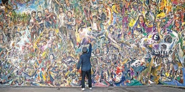 Haydar Özay’ın yaklaşık bir buçuk yıl çalışarak Mimarlar Odası’nın Karaköy’deki mekânında hazırladığı ve ilk olarak burada sergilenen resmi görmeye gittiğimizde, her karede başka bir zenginlikle karşılaşıyoruz. Özay resmini, burjuva sanat anlayışına karşı modern sanat galerilerinde değil de, açık havada, bu resimdeki hemen her acının, sevincin, felaketin yaşandığı sokakta yahut halka açık diğer mekânlarda sergilemek istediğini söylüyor.