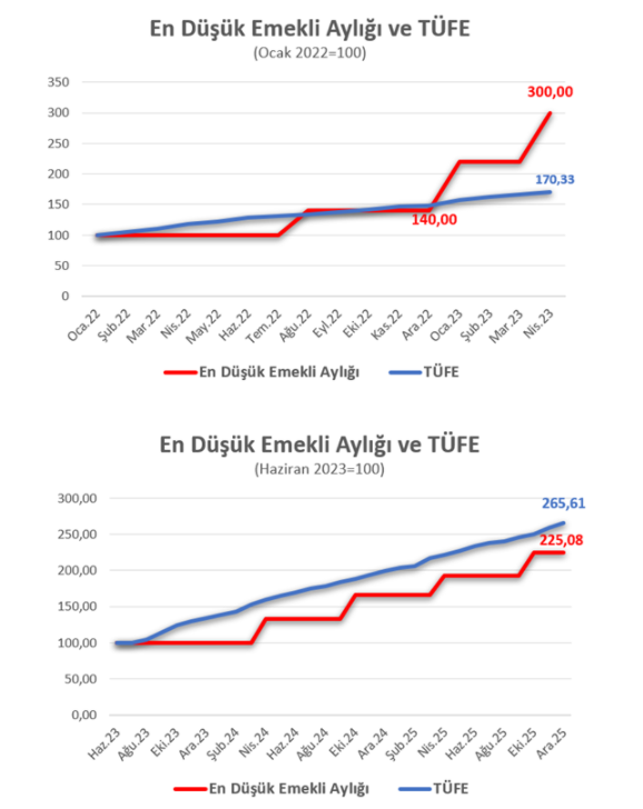 Haziran 2023 sonrasında paylaşılan ikinci grafik, dengelerin hızla değiştiğine işaret ediyor. TÜFE endeksi Haziran 2023’ten 2025 sonuna kadar yaklaşık yüzde 166 artarken, en düşük emekli aylığındaki artış bunun gerisinde kaldı. TÜFE endeksi 265 seviyesine ulaşırken, en düşük emekli aylığı endeksi yaklaşık 225’te kaldı. Bu fark, emeklilerin reel gelirinin giderek eridiğini ortaya koyuyor.