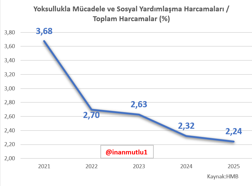 Ekonomist İnan Mutlu, sosyal medya hesabından yaptığı paylaşımda, yoksullukla mücadele ve sosyal yardımlaşma harcamalarının toplam merkezi yönetim harcamaları içindeki payını gösteren bir grafik yayımladı. Hazine ve Maliye Bakanlığı (HMB) verilerine dayanan grafiğe göre, söz konusu harcamaların toplam bütçeye oranı 2021’de yüzde 3,68 iken, 2022’de yüzde 2,70’e, 2023’te yüzde 2,63’e, 2024’te yüzde 2,32’ye ve 2025’te yüzde 2,24’e kadar geriledi.