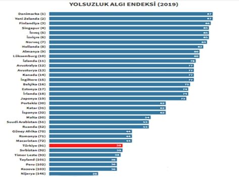 Kökeni 2010 yılına dayanan ve fiilen 2016 yılında Türkiye’nin otoriterleşmesiyle birlikte Dünya Yolsuzluk Algısı Endeksinde alt sıralara doğru itildik. Sudan, Yemen, Afganistan, Libya, Somali vb. gibi ülkelerde otoriter rejimlerin hâkim olduğu sömürge tipi rejimlerde yolsuzluk, rüşvet, adam kayırma, talan vb. suç kapsamına giren eylemlerin meşrulaştırıldığını görüyoruz. Türkiye 2019 Yolsuzluk Algı Endeksi sıralamasında düne kadar Belçika sömürgesi olan, Ruanda’dan (Orta Afrika ülkesi) sonra gelen, 100 üzerinden 39 puanla 91. sırada yer almış bir ülkedir. Ruanda’nın yolsuzluk algı endeksindeki yeri Türkiye’nin bir hayli üstündedir.