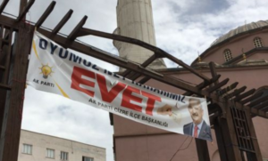 Her yerde AKP’nin varlığı görülüyor. Flamalar, afişler, pankartlarda “Evet” var.
