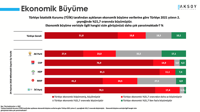 Aksoy Araştırma tarafından yürütülen Türkiye Monitörü araştırmasında, TÜİK tarafından açıklanan ekonomik büyüme verilerine göre Türkiye 2021 yılının 2. çeyreğinde %21,7 oranında büyüdüğü açıklandı. Ekonomik büyüme verisiyle ilgili ‘hangisi sizin görüşünüzü daha çok yansıtmaktadır?’ sorusu soruldu. Araştırma sonuçlarına göre, katılımcıların yüzde 51,8’i “Türkiye ekonomisi büyümemiş, küçülmüştür” yanıtını verirken; yüzde 19,8 “Türkiye ekonomisi %21,7 oranından daha az büyümüştür” yanıtını verdi.