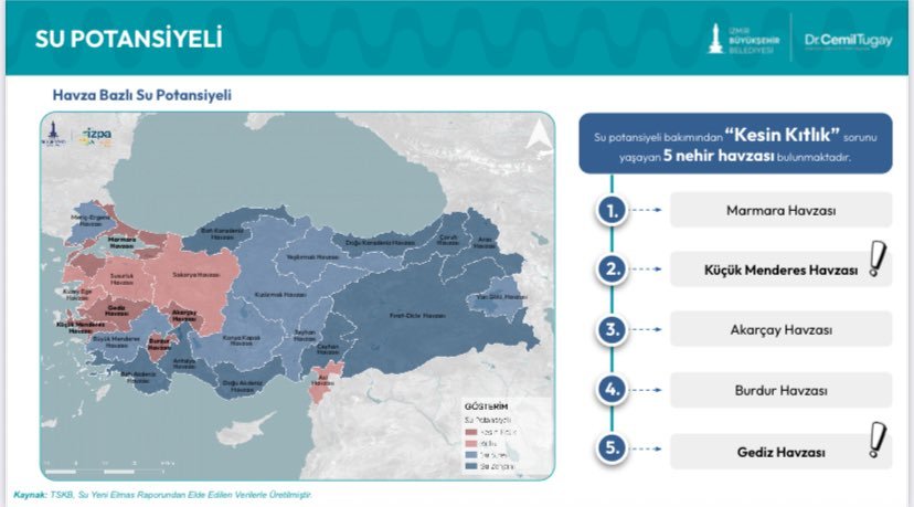Paylaşımda Türkiye’nin su stresi riski yüksek ülkeler arasında yer aldığına işaret edildi. Ülkede beş havzanın “kesin su kıtlığı” yaşadığı belirtilirken, İzmir için hayati öneme sahip Gediz ve Küçük Menderes havzaları öne çıkıyor. Sorunun artık kent sınırlarını aşarak havza ölçeğinde ele alınması gerektiği vurgulanıyor.