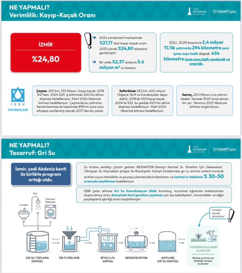 İzmir Büyükşehir Belediyesi’nin son dönemde attığı adımlar, yerel yönetimlerin krize karşı oynayabileceği role işaret ediyor. Kayıp-kaçak oranlarının düşürülmesiyle bir yılda 5,6 milyon metreküp su kaybının önlendiği, İzmir’in bu alanda Türkiye’nin en iyi beş ili arasında yer aldığı belirtiliyor.