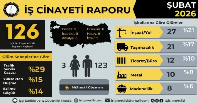 İSİG Meclisi’nin ulusal basın, yerel basın ve saha kaynaklarından derlediği verilere göre 2026 yılının Şubat ayında en az 126 işçi iş cinayetlerinde yaşamını yitirdi.