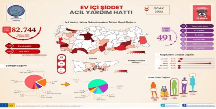 TKDF, Ev İçi Şiddet Acil Yardım Hattı Ocak 2022 verilerini açıkladı. Buna göre; ocak ayında Acil Yardım Hattı’na 491 çağrı geldi. Bunlardan 134’ü ‘vaka dosyası’ haline getirildi. Çağrılardan 88’ine hukuki bilgilendirme yapılırken 40 çağrı karakola yönlendirildi. 11 çağrıda ise sığınak talebinde bulunuldu.