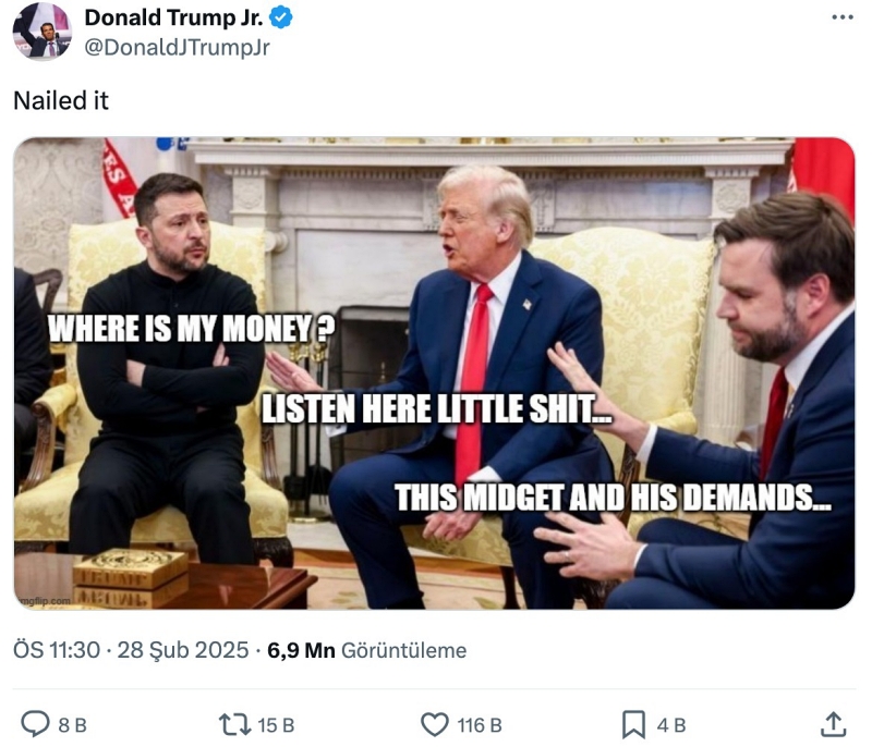 Trump Jr.’ın paylaştığı montajlı görselde, Zelenskiy’in üzerine “Paran nerede?” yazılırken, Donald Trump’ın ağzından “Dinle küçük pislik…” ifadesi eklenmişti. Başkan Yardımcısı J.D. Vance’in üzerinde ise “Bu cüce ve talepleri…” ibaresi yer aldı. Trump Jr., görseli “Her şeyi özetliyor” notuyla paylaştı.