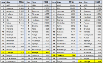 Türkiye, 2001 krizi öncesinde (2000 yılında) dünyada 17’nci sırada yer alıyordu. Kriz sonrası uyguladığı ekonomik programın yarattığı ivmeyle 2014 yılında 16’ncı sıraya yükselmişti. Ne var ki burada kalamadı ve 2017 yılında tekrar 17’nci sıraya, 2018 yılında ise 18’inci sıraya geriledi. Eğer IMF’nin tahminleri gerçekleşirse 2019 yılı sonunda 20’nci sıraya düşeceği anlaşılıyor.