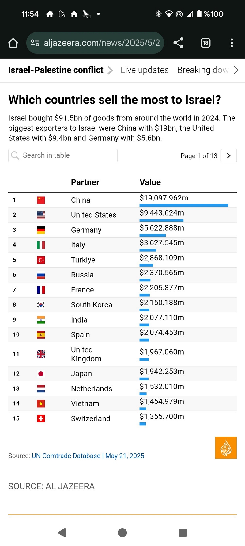 Birleşmiş Milletler Ticaret Veritabanı’na dayanan güncel veriler, Türkiye’nin İsrail’e en çok mal ihraç eden ülkeler arasında beşinci sırada yer aldığını ortaya koydu. El Cezire’nin haberleştirdiği veriler, Çin, ABD, Almanya ve İtalya’nın ardından Türkiye’nin, İsrail’in en büyük beşinci tedarikçisi konumunda olduğunu gösteriyor. Türkiye’yi sırasıyla Rusya, Fransa, Güney Kore, Hindistan ve İspanya takip ediyor.