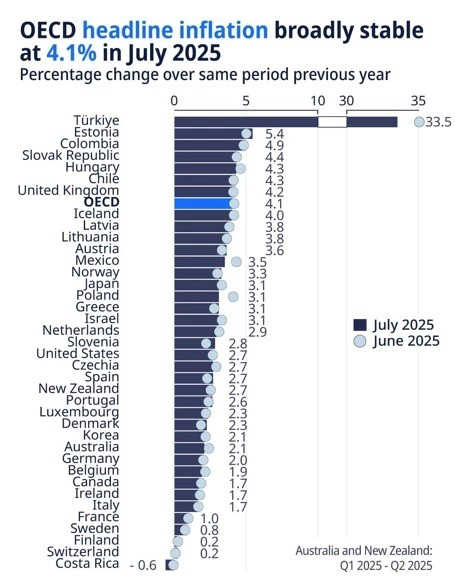 Ekonomik Kalkınma ve İşbirliği Örgütü’nün (OECD) yayımladığı son Tüketici Fiyat Endeksi (TÜFE) raporu, Türkiye’nin Temmuz 2025 itibarıyla enflasyonda zirveye yerleştiğini ortaya koydu. Türkiye’de yıllık enflasyon yüzde 33,5 olarak ölçülürken, OECD ortalaması yüzde 4,1 seviyesinde kaldı. Böylece Türkiye, örgüt üyesi 38 ülke arasında açık ara en yüksek enflasyona sahip ülke oldu.