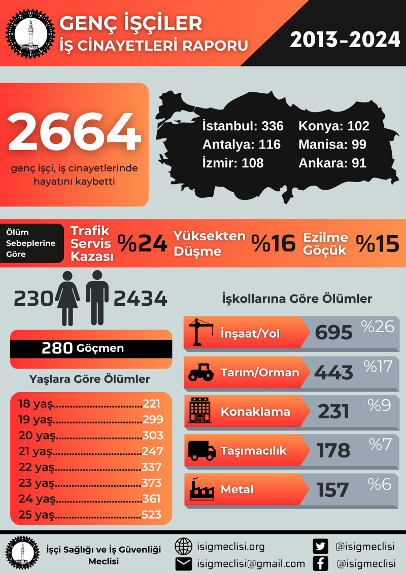Türkiye’de genç işçiler, güvencesiz çalışma koşulları, yoksulluk ve denetimsizlik nedeniyle adeta “ölümle burun buruna” çalışıyor. İş Sağlığı ve Güvenliği (İSİG) Meclisi’nin açıkladığı verilere göre, 2013-2024 yılları arasında en az 2664 genç işçi iş cinayetlerinde hayatını kaybetti. Bu ölümlerin %93’ü ücretli çalışanlardan oluşurken, genç kadınlar ve göçmen işçiler en kırılgan gruplar olarak öne çıkıyor.
