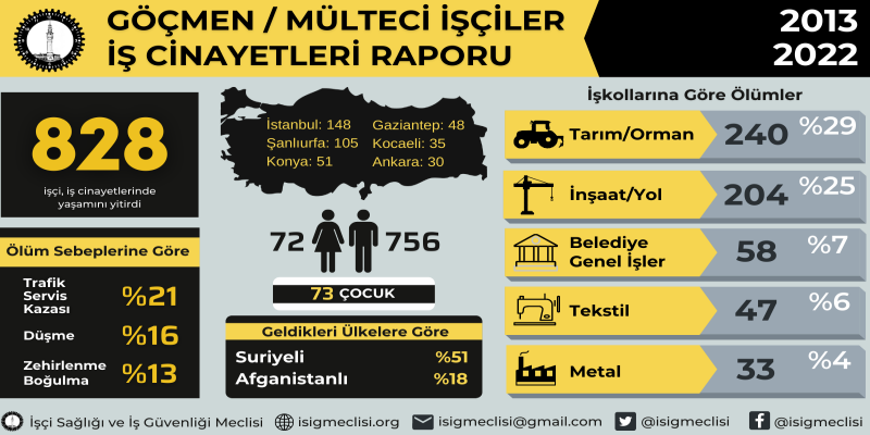 İşçi Sağlığı ve İş Güvenliği Meclisi (İSİG), son on yılda (2013-2022) Türkiye’de en az 828 göçmen/mülteci işçinin iş cinayetlerinde hayatını kaybettiğini açıkladı.