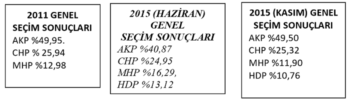 1 Kasım 2015 seçimlerinde her şey siyasî tablonun 7 Haziran öncesine, 12 Haziran 2011 Genel Seçimlerine geri döndürülmesine göre ayar edilmişti. Öyle de oldu, ancak tek farkla, HDP yine barajı aşmış, 2011 Seçimlerinde yaratılan iklime dönme senaryosu da tutmamıştı. 1 Kasım 2015 seçimlerinin 7 Haziran 2015 seçimlerinin değil, 12 Haziran 2011 seçimlerinin bir tekrarı olarak senaryo edildiğine dikkatinizi çekmek istiyorum. Lütfen aşağıdaki tablolarda verdiğim sonuçlara bir karşılaştırın. Sizce de Kasım 2015 seçimleri tek bir farkla tarihi 2011’e döndürmeye çalışmıyor mu?