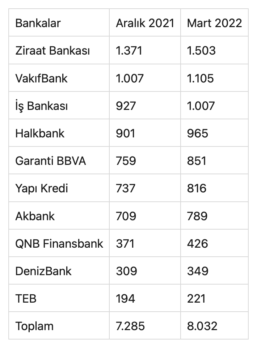 Türkiye’nin en büyük 10 bankasının Aralık 2021 ve Mart 2022 sonu itibarıyla aktif büyüklüğü (milyar TL) şöyle: