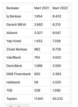 Türkiye’nin en büyük 10 bankasının Mart 2021 ve Mart 2022 sonu itibarıyla net dönem kârları (milyon TL) şöyle: