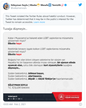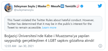 Soylu, “Boğaziçi Üniversitesi’nde Kabe-i Muazzama’ya yapılan saygısızlığı gerçekleştiren 4 LGBT sapkını gözaltına alındı!” ifadelerini kullanmıştı.